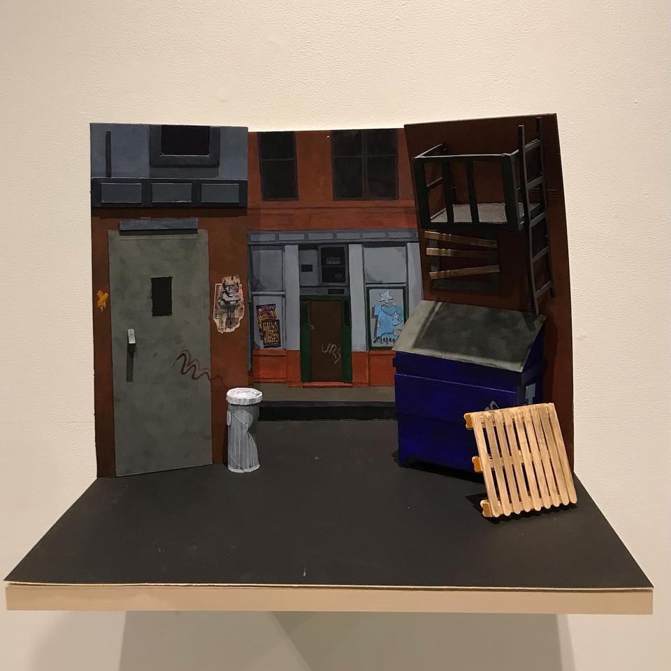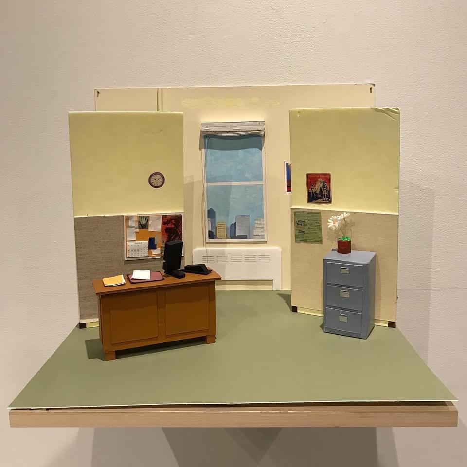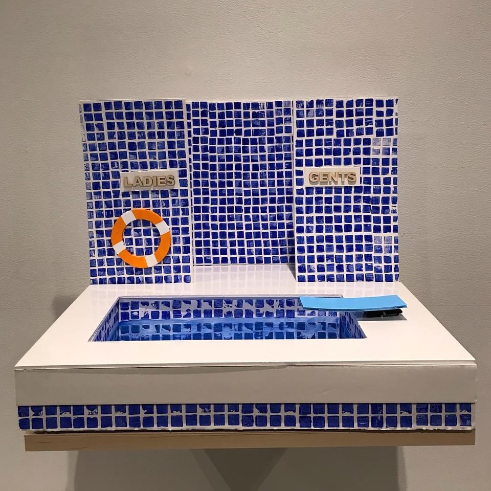 Complementing the whimsical illustration are meticulously crafted miniature sets: a government office, a municipal pool, and a gritty back alley. Constructed from common household items during lockdown, these dioramas evoke familiar spaces with both humour and critique. The deliberately makeshift quality of the sets underscores the constraints of pandemic isolation while celebrating the ingenuity and artistic spirit that emerged during this time.